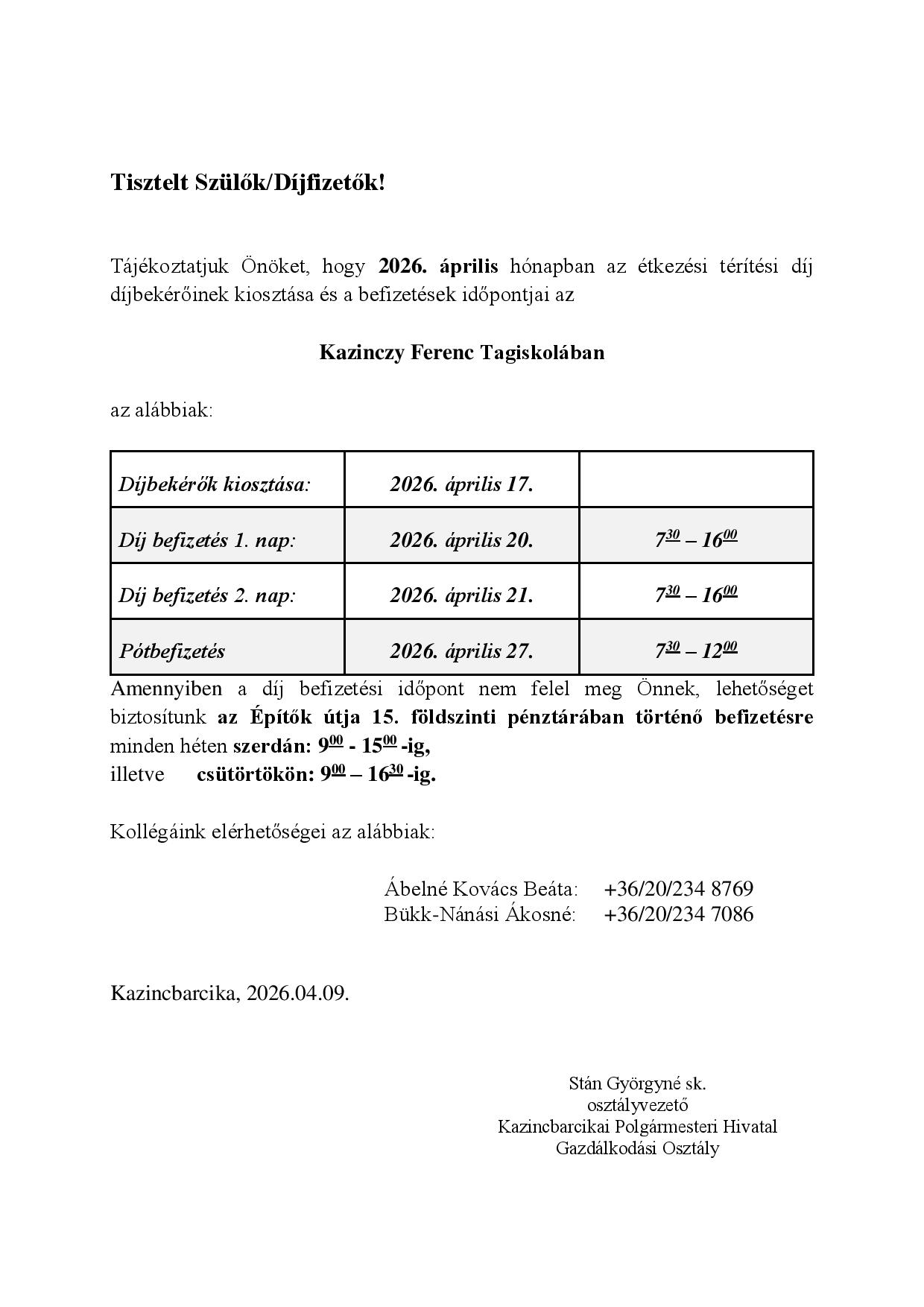Étkezési térítési díj befizetése a Kazinczyban – 2026 Április