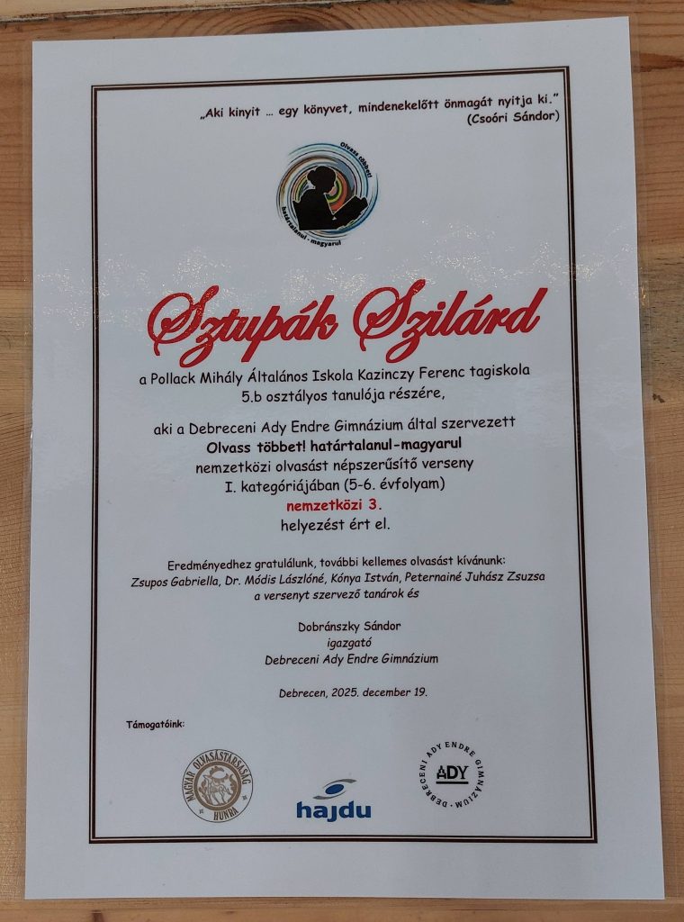Sztupák Szilárd iskolánk 5.b osztályos tanulója, az „Olvass többet! határtalanul – magyarul” nemzetközi olvasást népszerűsítő versenyen 3. helyezést ért el.