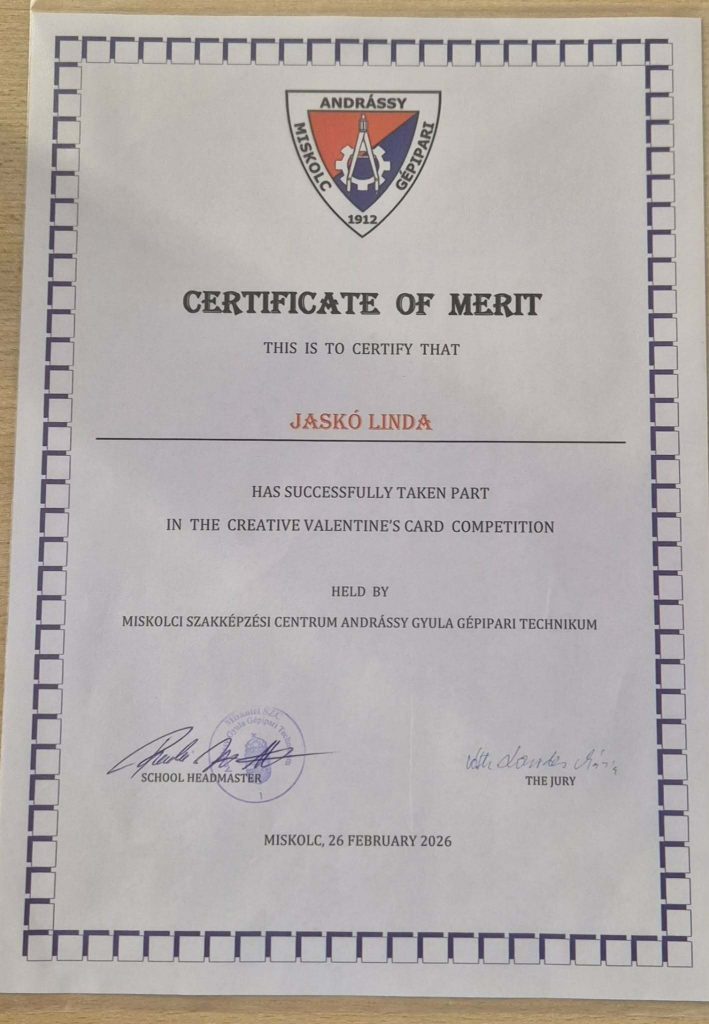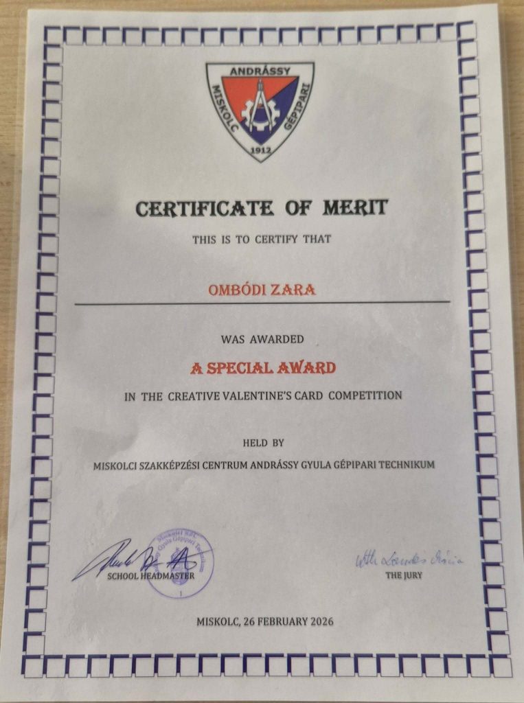 A Miskolci SZC Andrássy Gyula Gépipari Technikum angol nyelven írt Valentin-napi üdvözlőkártya vagy képeslap tervezésére és elkészítésére invitálta a térség általános iskolás és középiskolás tanulóit.