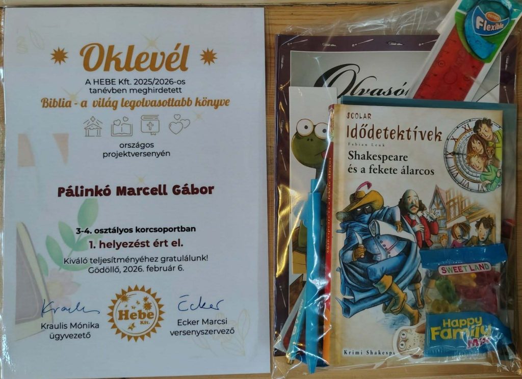 Iskolánk 4.b osztályos tanulója, Pálinkó Marcell Gábor országos 1. helyezést ért el korosztályában (3-4.osztály) a „Biblia, a világ legolvasottabb könyve” című levelezős versenyen (HEBE Kft).