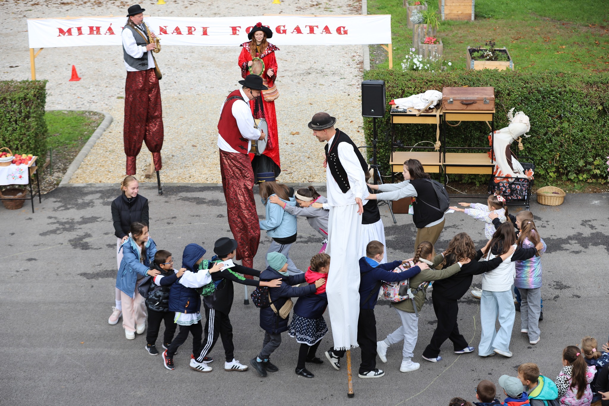 Iskolánkban idén is életre kelt a hagyomány: a Mihály-napi vásár. A vidám hangulatról a Vagabanda gondoskodott, a gyerekek pedig több mint húsz állomáshelyen próbálhatták ki a népi játékokat, valamint néptáncoltak, mustot készítettek, kukoricát morzsoltak – mindezt egy-egy népmese köré szőve. A vásári kikiáltót követően még Döbrögi is megkapta a magáét: az utolsó azaz harmadik 25 botütéssel. Ezután pedig kezdetét vehette az igazi vásári forgatag. A forgatagban készülét képeket megtekintheti a galériában.