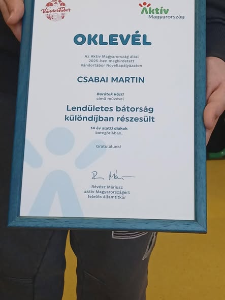Gratulálunk Csabai Martin tanulónknak, aki a Vándortábor Novellapályázaton „Barátok közt!” című írásával különdíjat nyert a 14 év alattiak kategóriájában. Szívből gratulálunk, és további sok sikert kívánunk!